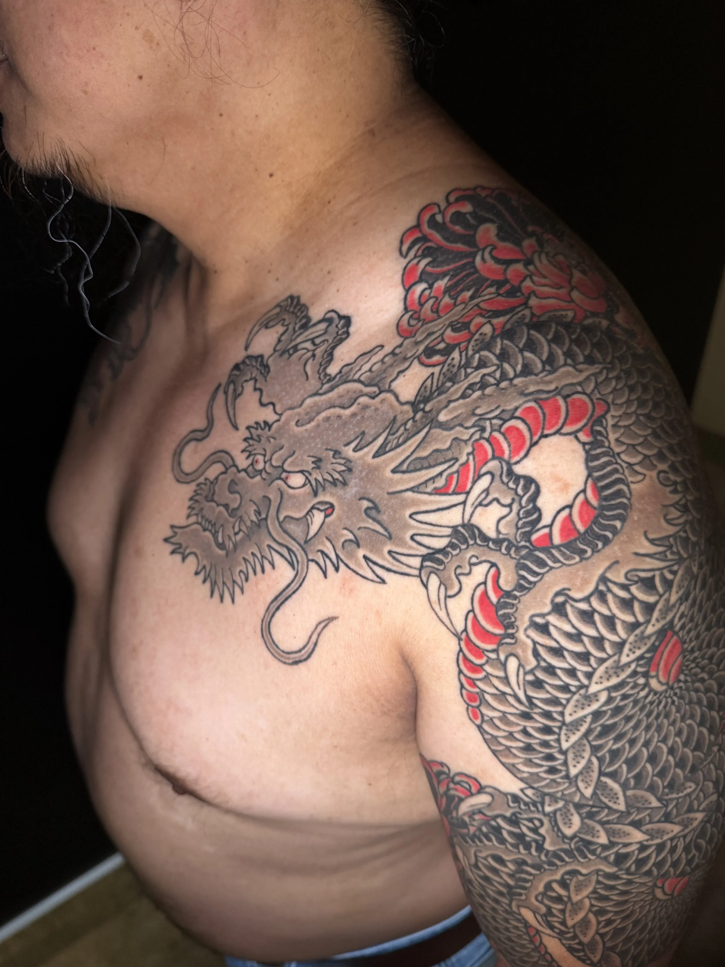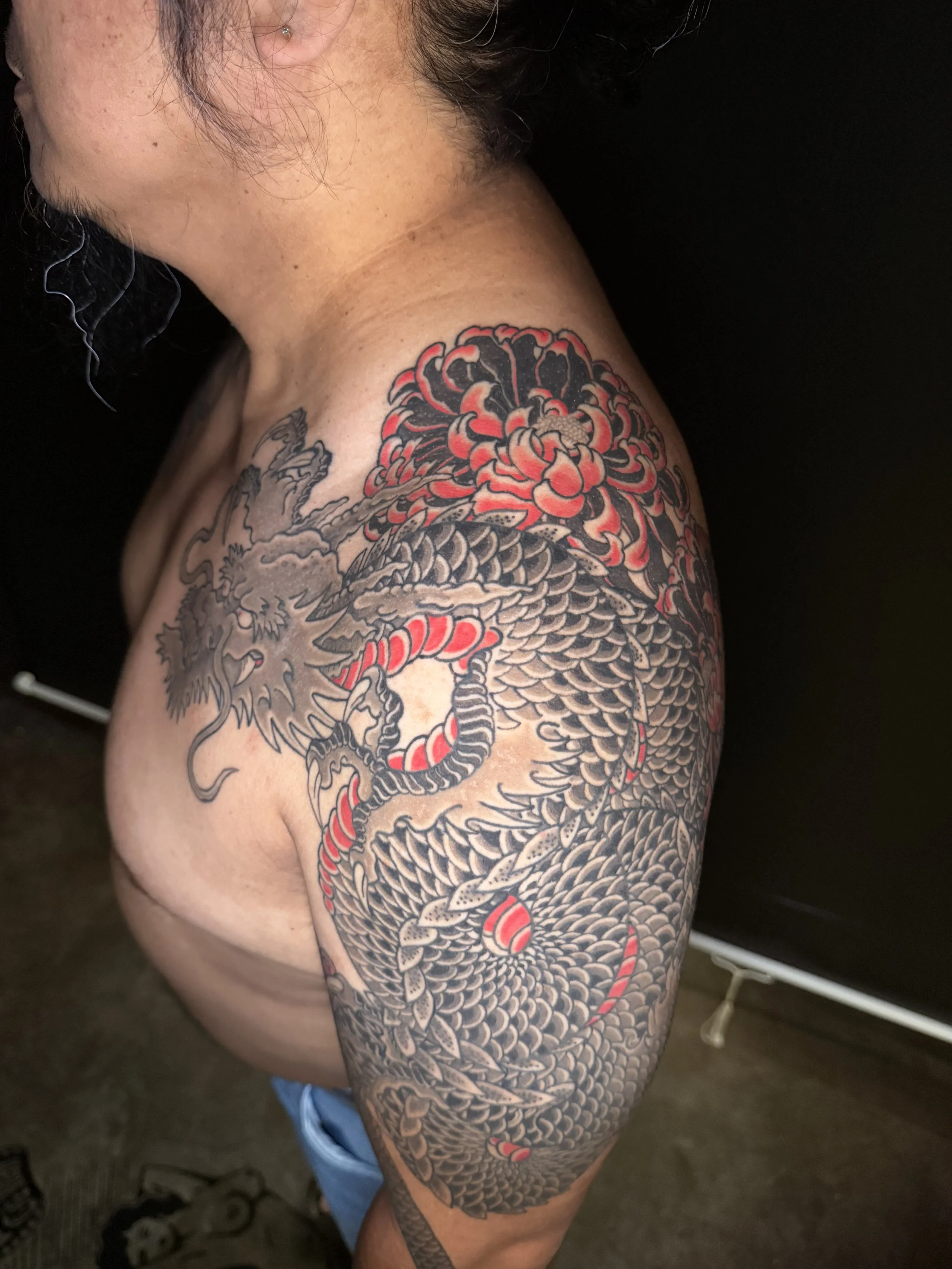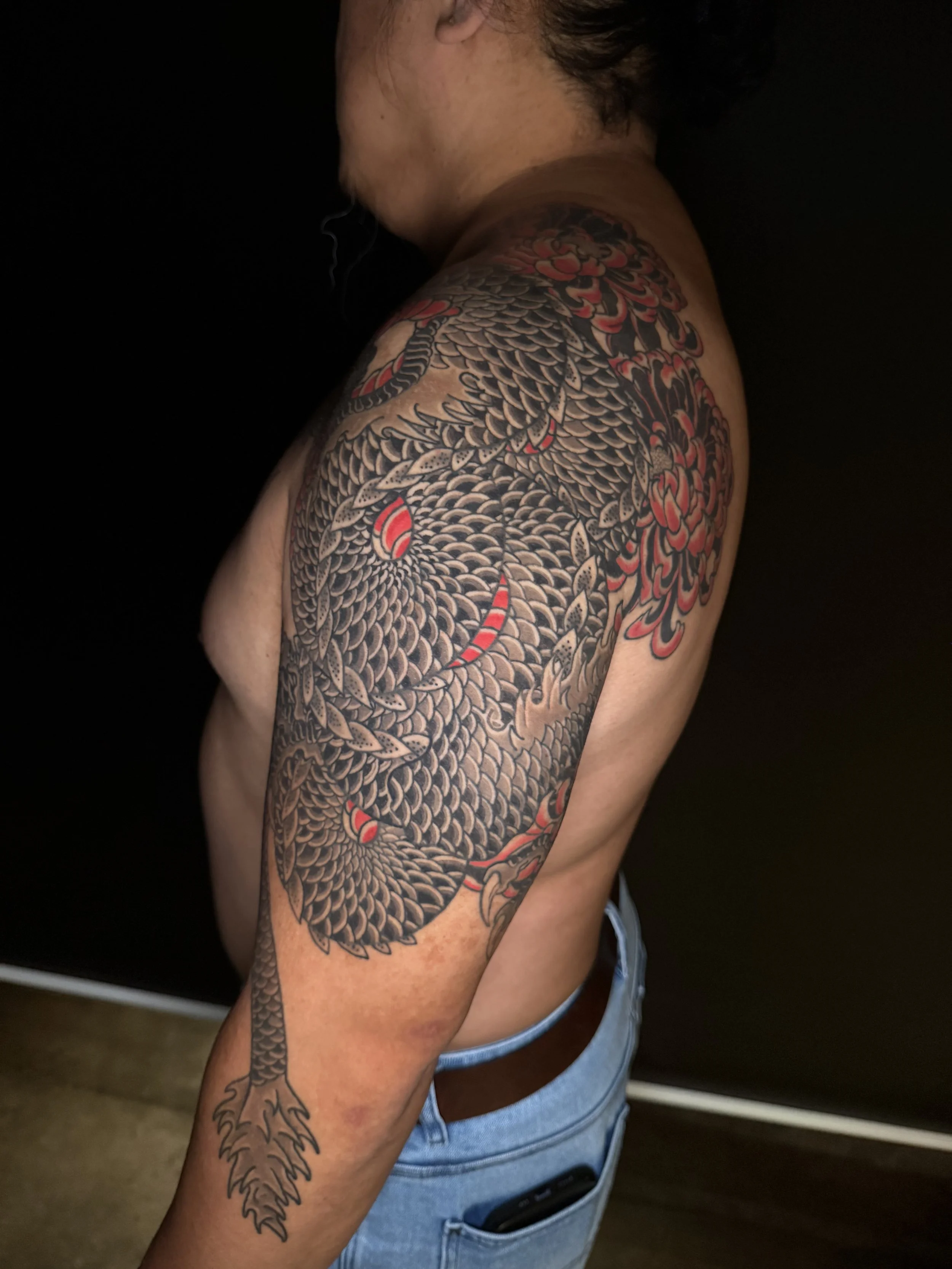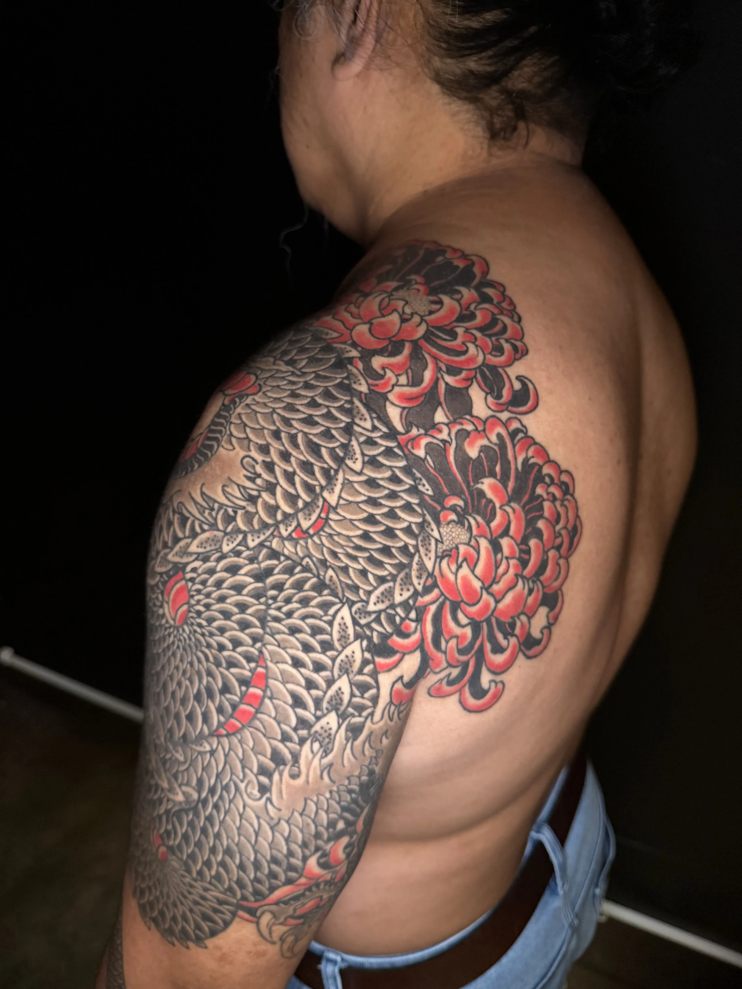 Dre specialises in Traditional Japanese tattooing, he draws inspiration from woodblock prints of the Edo period, keeping as close to the true Japanese aesthetic as possible.